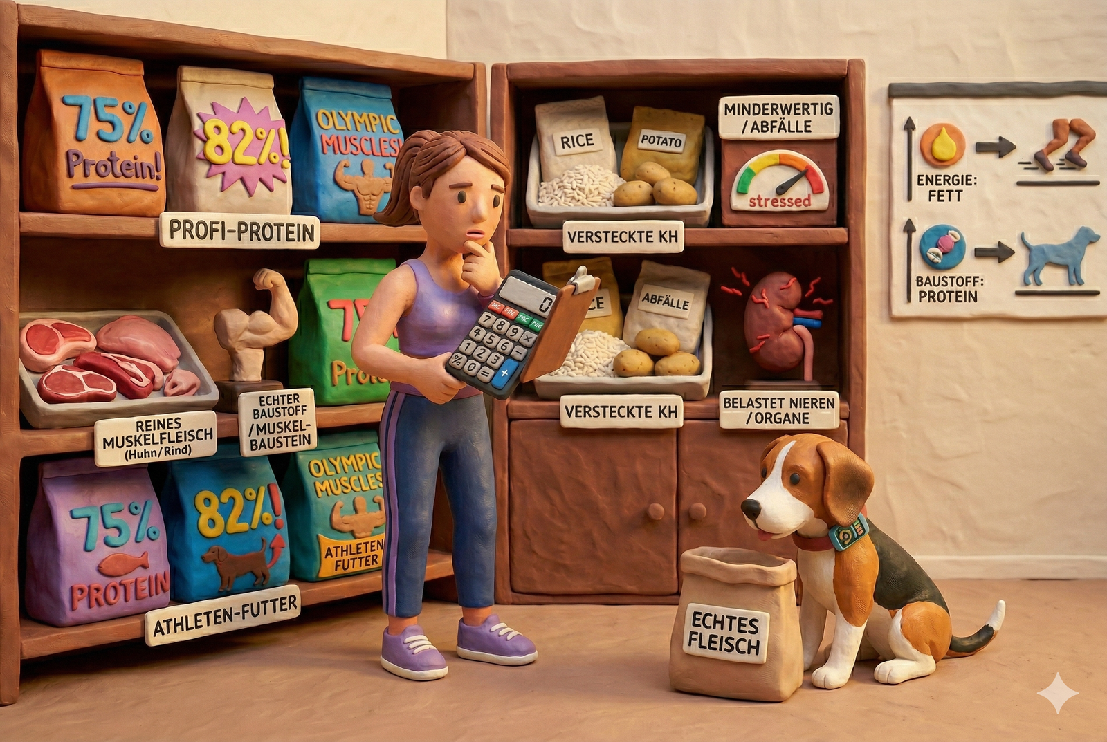 Damit du dich in diesem Dschungel aus Deklarationen der Artikel nicht komplett verirrst (und dein Hund nicht verhungert, während du noch rechnest), bringen wir hier Licht ins Dunkel. In diesem Beitrag erfährst du alles, was du für ein gesundes Hundeleben wirklich wissen musst: vom echten biologischen Bedarf über versteckte Kohlenhydrate bis hin zu der Frage, warum der Spruch „Viel hilft viel“ beim Protein oft gewaltig nach hinten losgeht.